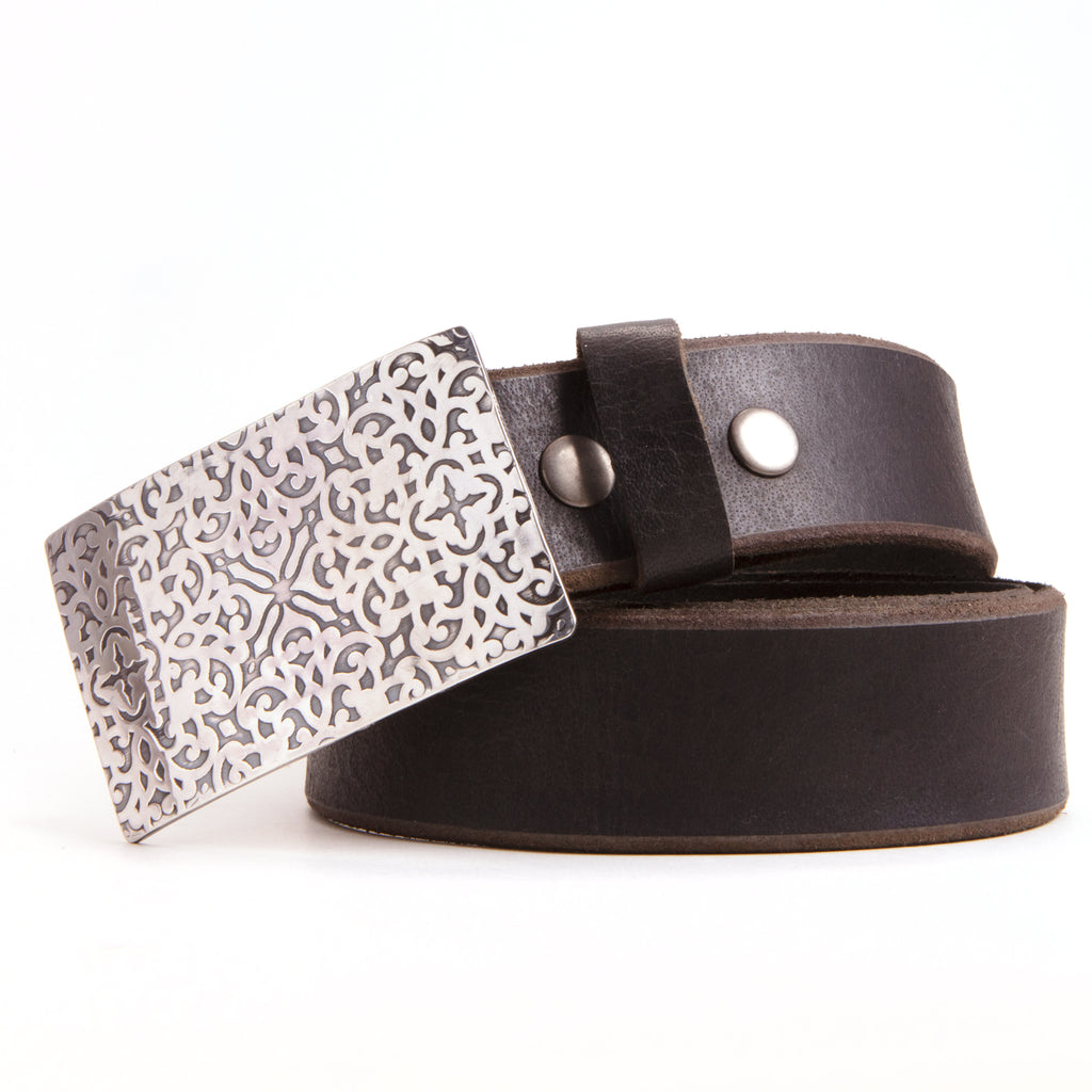Sterling silver Hand pressed and shaped. Weathered to a vintage look and feel a full grain leather strap in black.  The strap is sized at 38 but should fit waist sizes 32-36 "