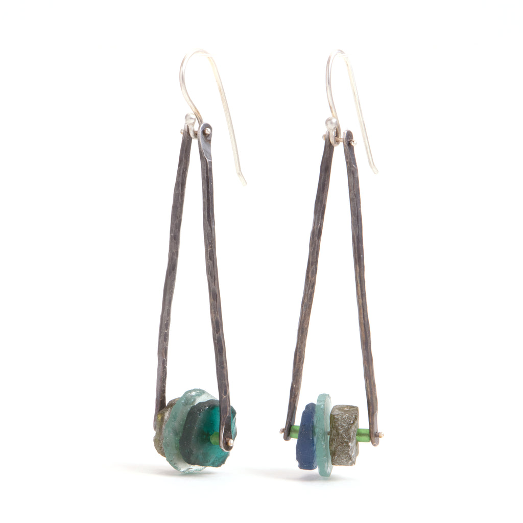 Fine silver hammered, blackened, and polished. Unique roman glass all placed on sterling silver handmade ear wires.