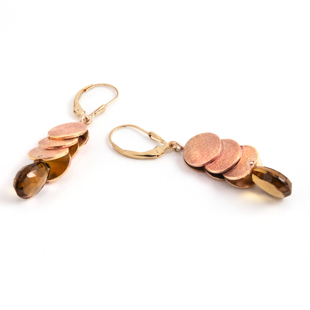Stipple texture and layered gold disks. Faceted teardrop smokey quartz stones swing freely. Lever back ear wires keep these earring from coming out.