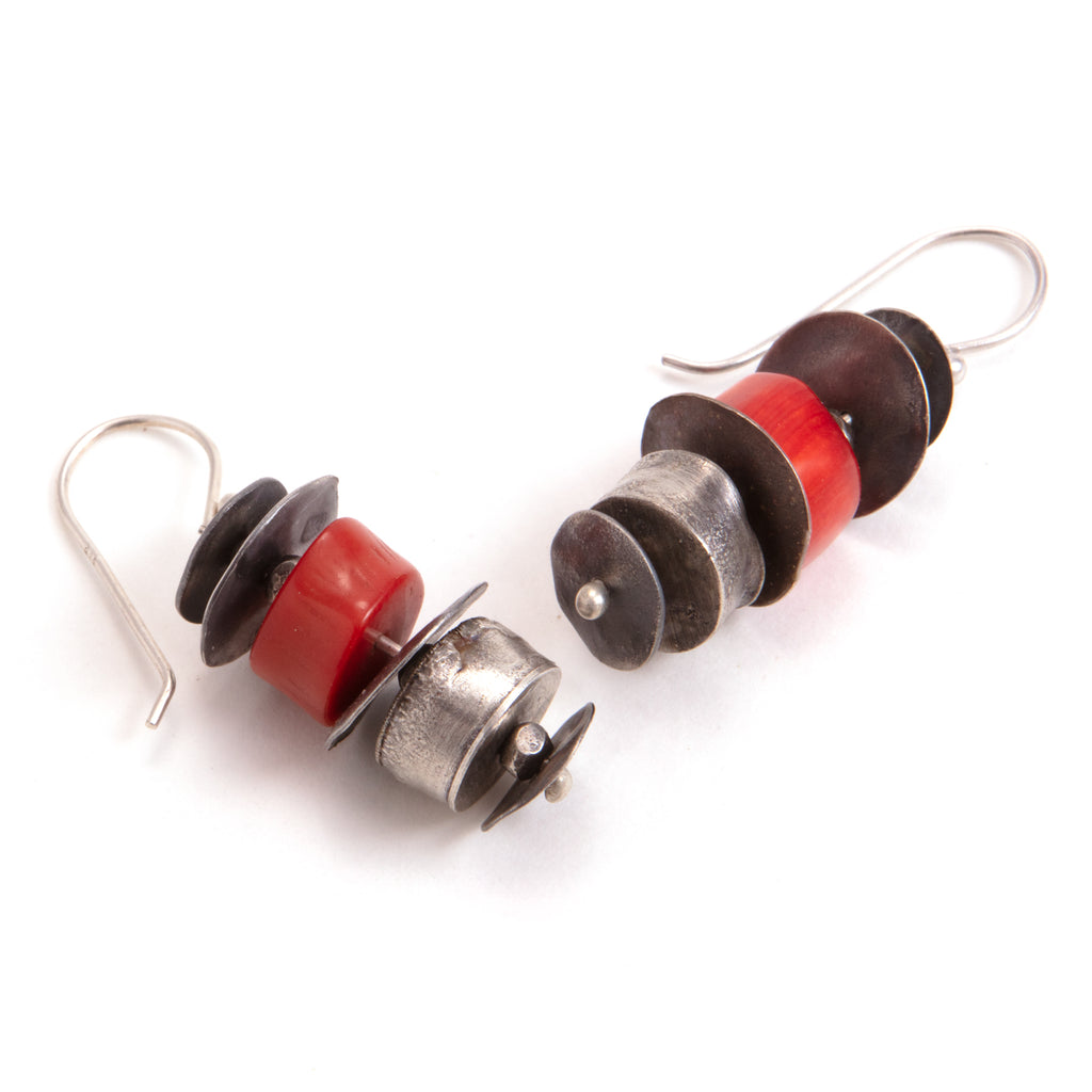 Fine silver hammered, blackened, and polished. Hand made sterling Heishi tubes with sterling hammered beads.