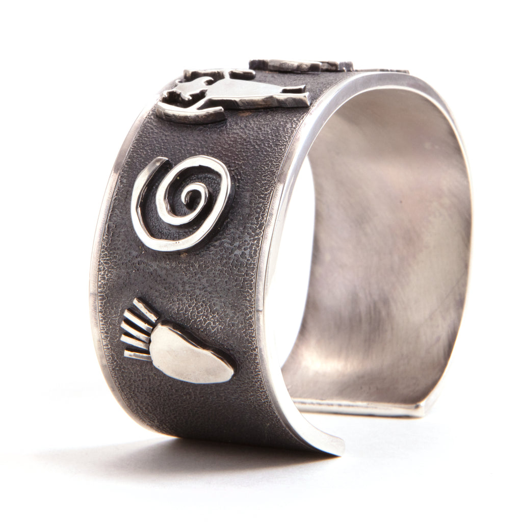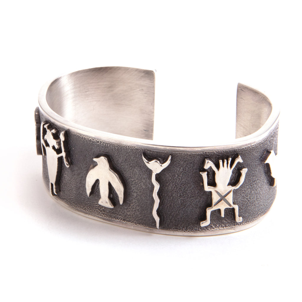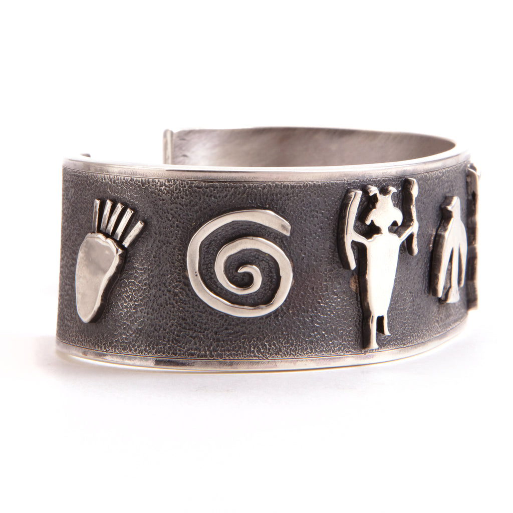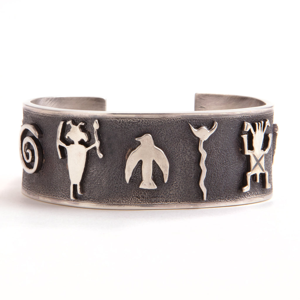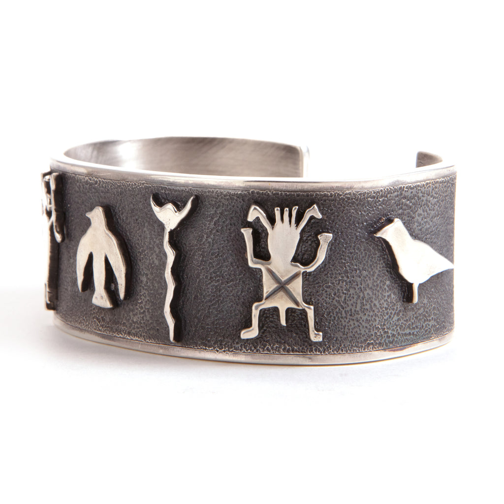 A collaboration with the internationally recognized artist Terrel Powell.Solid sterling silver,150 grams. Symbols from early American Indians. Each symbol was hand pierced/ carved and soldered into place. The base has a stippled texture that has been blackened with polished side rials. Heirloom piece.