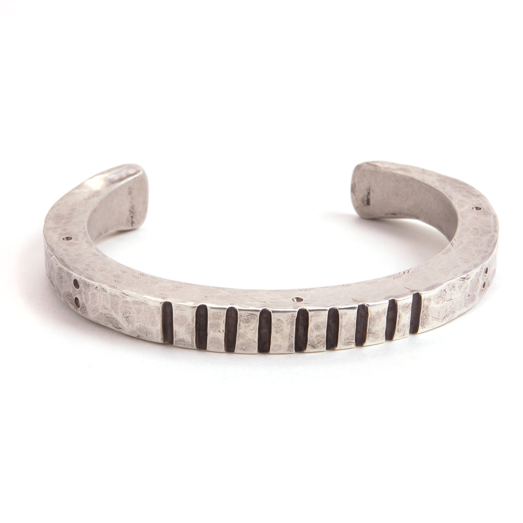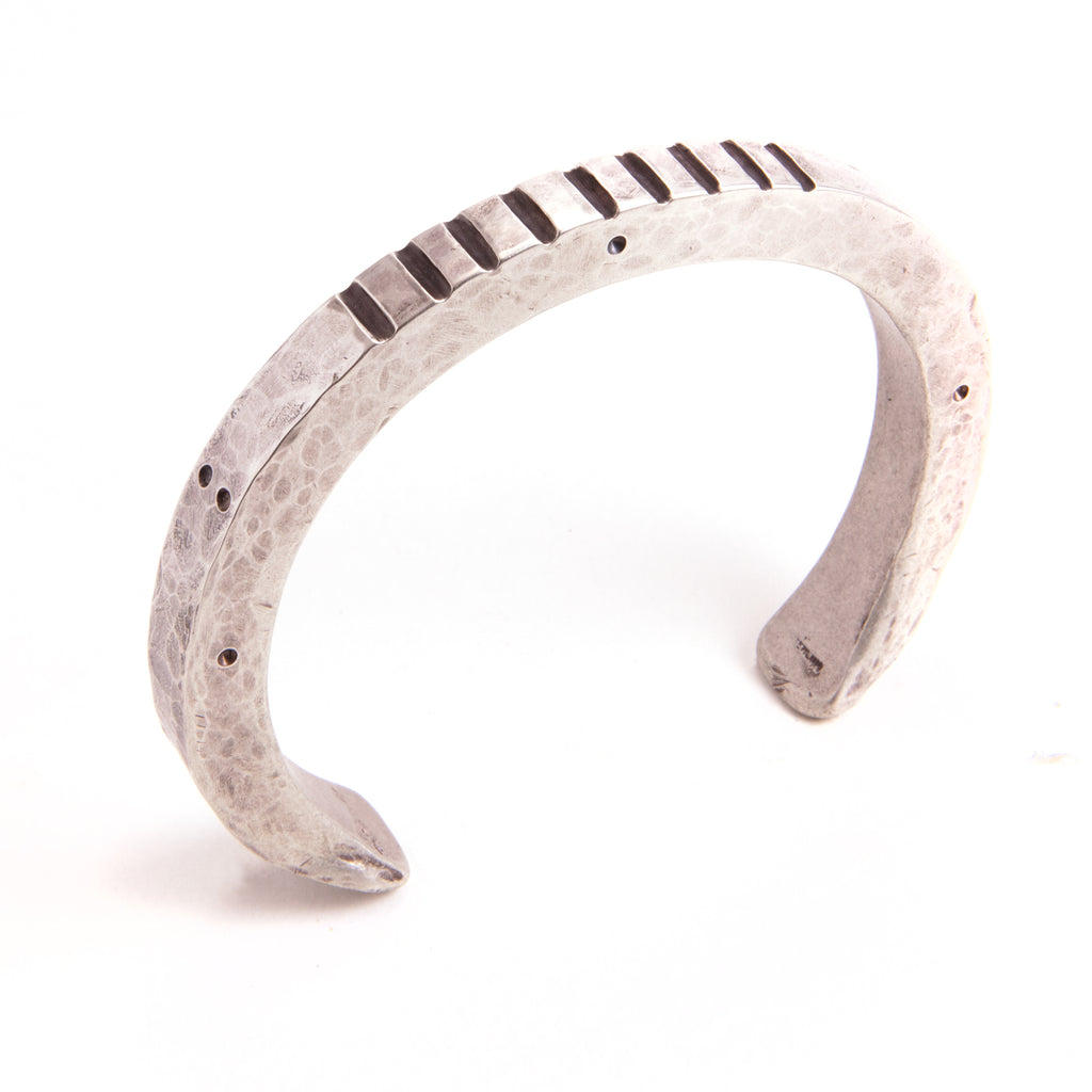 Solid sterling, hammered etched with a mat finish. 128 grams. A formidable statement piece.