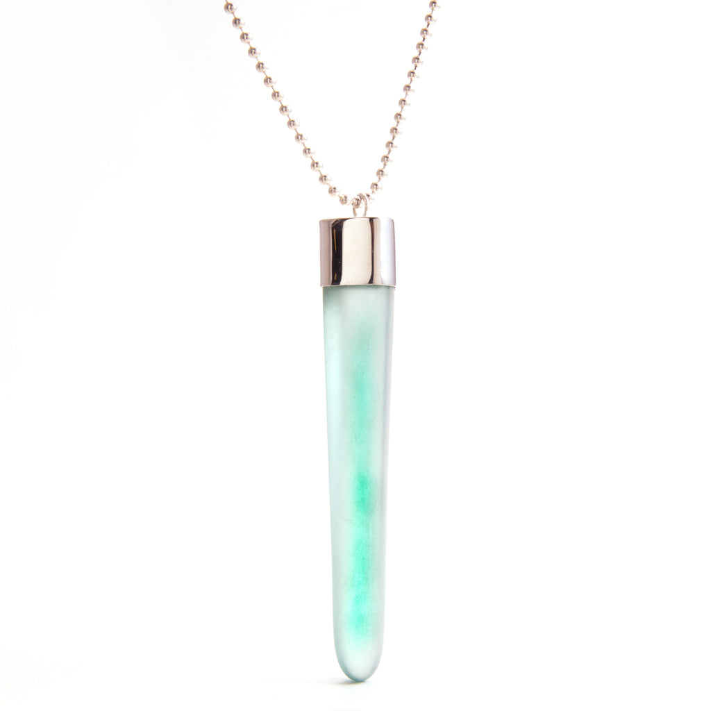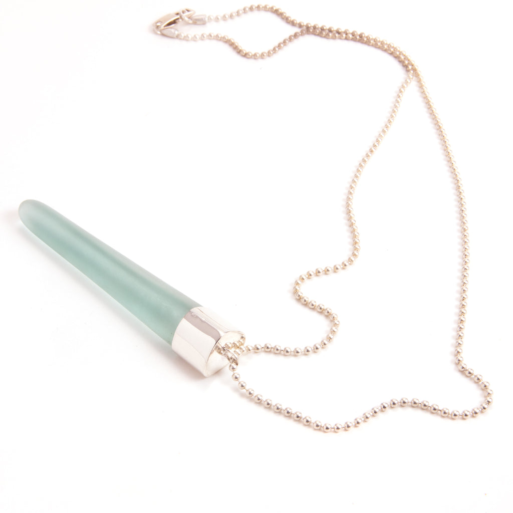 Sandblasted glass 3.5" tall. Fitted in a custom sterling silver cap. Hanging from a sterling silver ball chain.