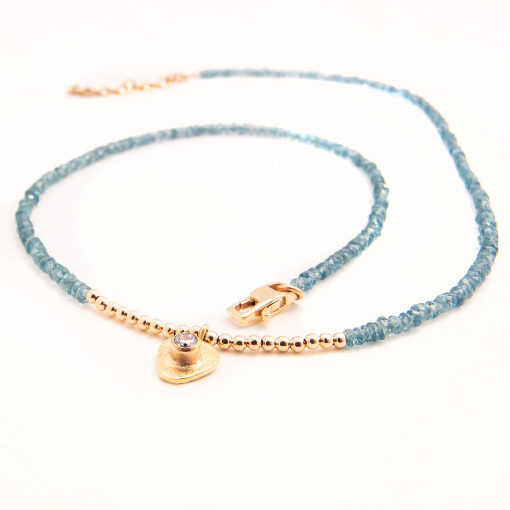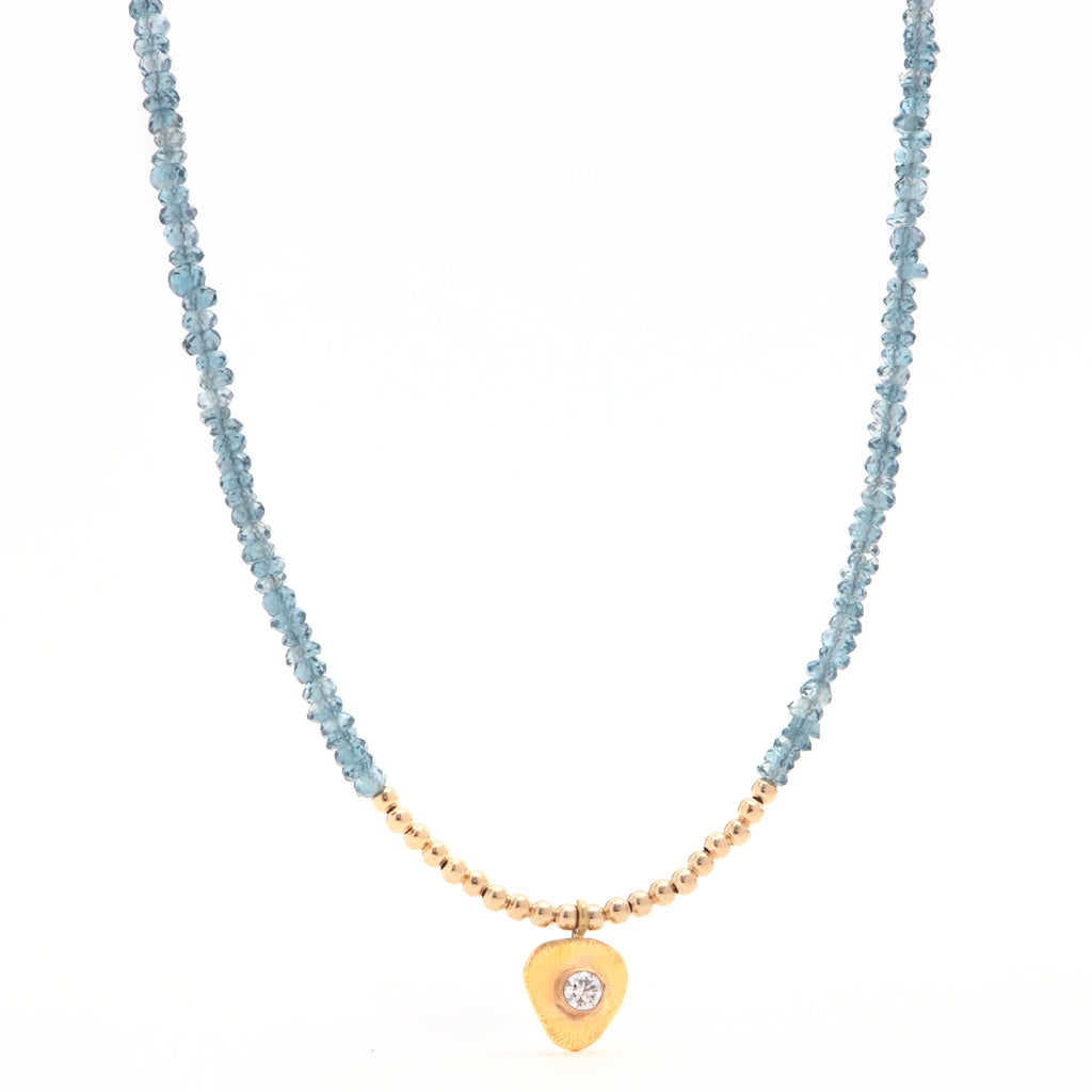 Solid 14k gold beads. 14k gold clasp. Just under one gram of 18k gold pendant with G+/S11 3.1mm round natural diamond.