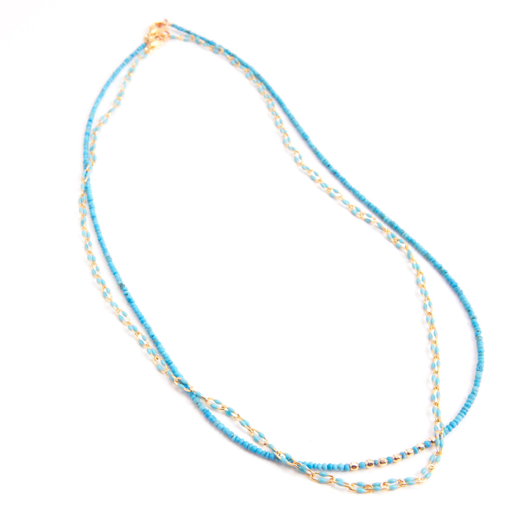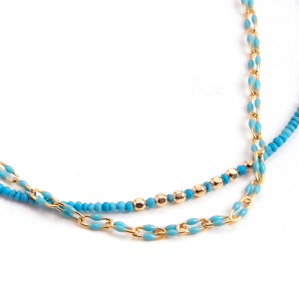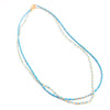 These two necklaces pair beautifully together. The first necklace is Afghan Turquoise with 7 gold filled beads. The second necklace is a Turquoise and gold filled chain. Both necklaces are 16" long. Sold as set.