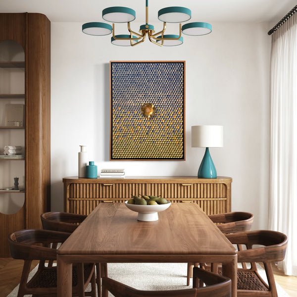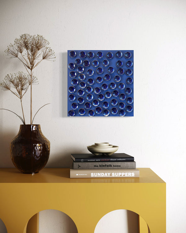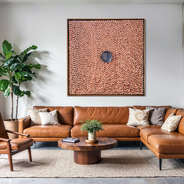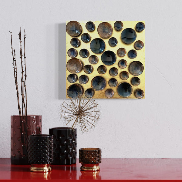 These handmade art pieces feature a painted or illustrated background and hundreds to thousands of copper discs. Each disc is handcrafted to a specific size and style before being mounted directly into the board.