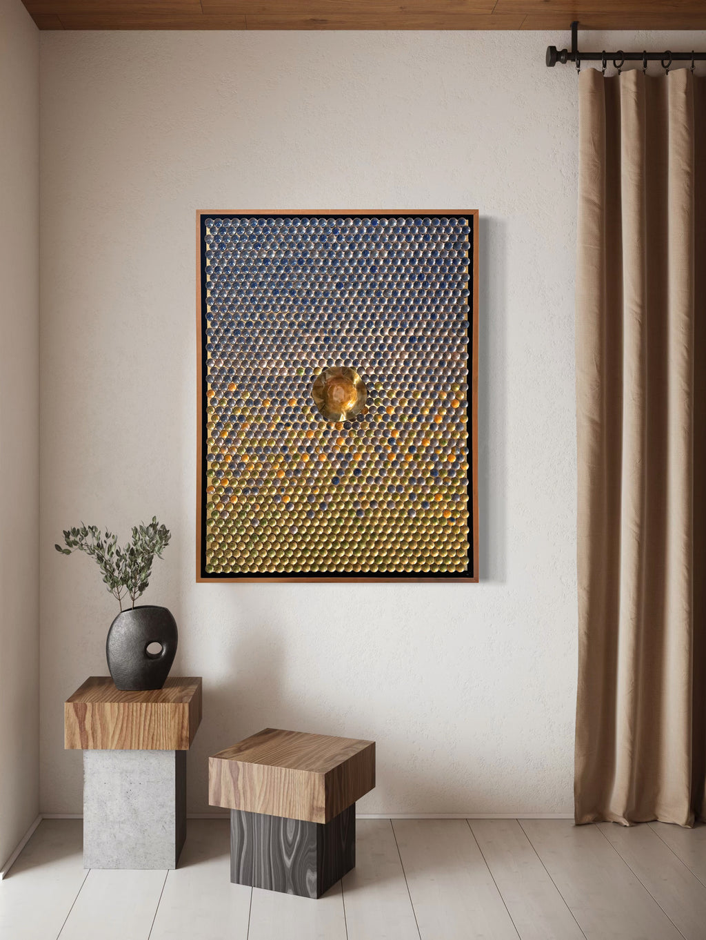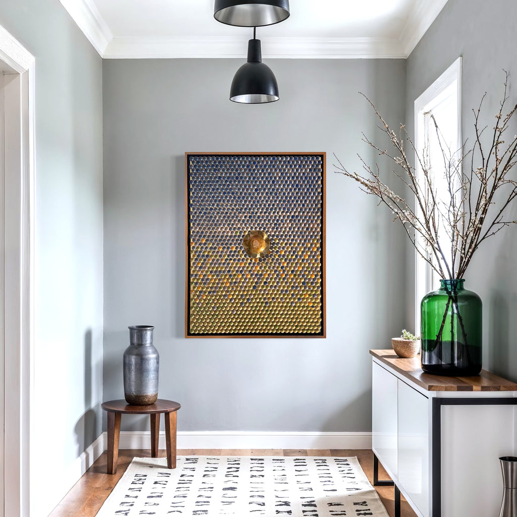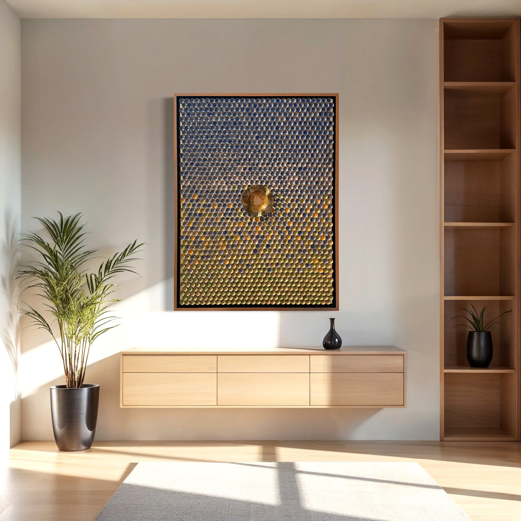 1,350 Individually made enamel bowls. Warm greens to cool blues. The center is a hand forged bowl that has been enameled in a deep gold. All set on a gold leafed background. Float framed.
